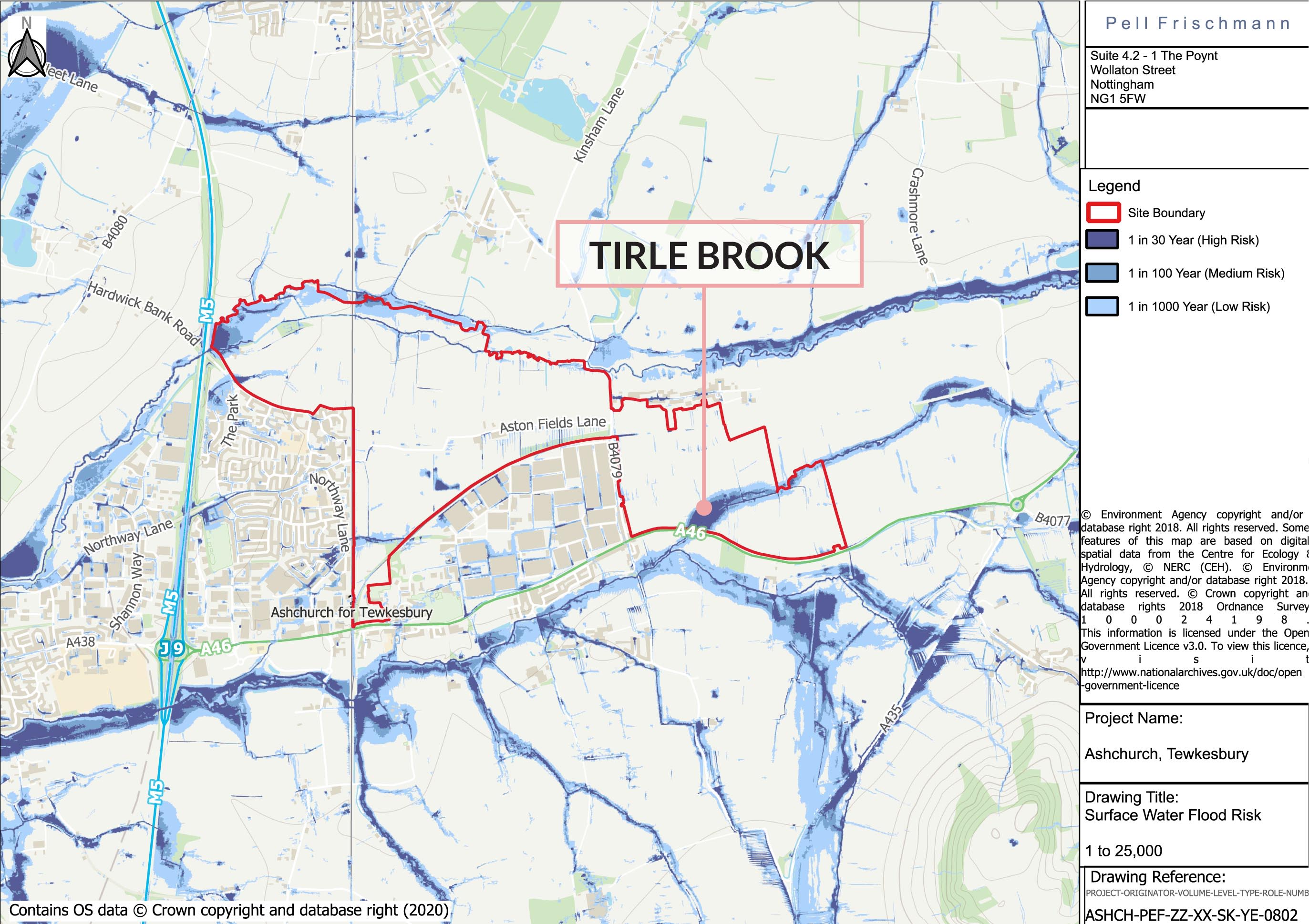 The Environment Agency Surface Water Flood Risk Map shows the broad flood risk in the local area indicating those areas affected, primarily along the Tirle Brook, at the eastern end of the site. (CLICK IMAGE TO OPEN IN A NEW WINDOW)